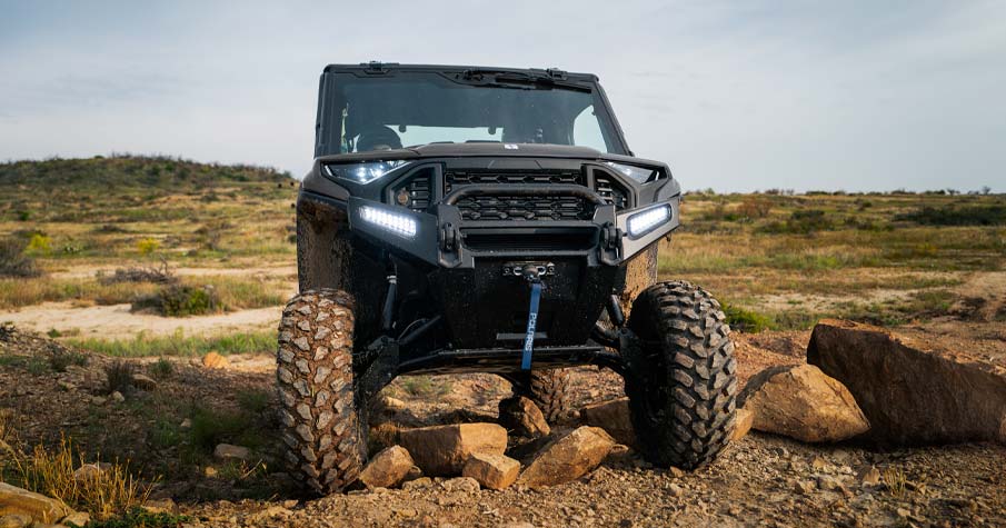 - Factory-installed cab system with powered doors, roof, tip-out glass windshield, glass rear panel, rearview mirror, windshield wiper/washer, and sound insulation materials, Factory-installed heat, AC, defrost, recirculation with 5 different airflow settings, Speed limiting controlled in RIDE COMMAND, 140-amp charging system, Polaris PULSE electrical system (3-position hood and 3-position roof), USB charger, trickle charger, 12-volt accessory outlet, battery trickle-charging port, Pro Series 6,000 LB Winch with synthetic rope, Auto Stop, wireless remote and Rapid Rope Recovery, Large steel bumper, full-coverage skid plate, bumper D-rings, and top bar