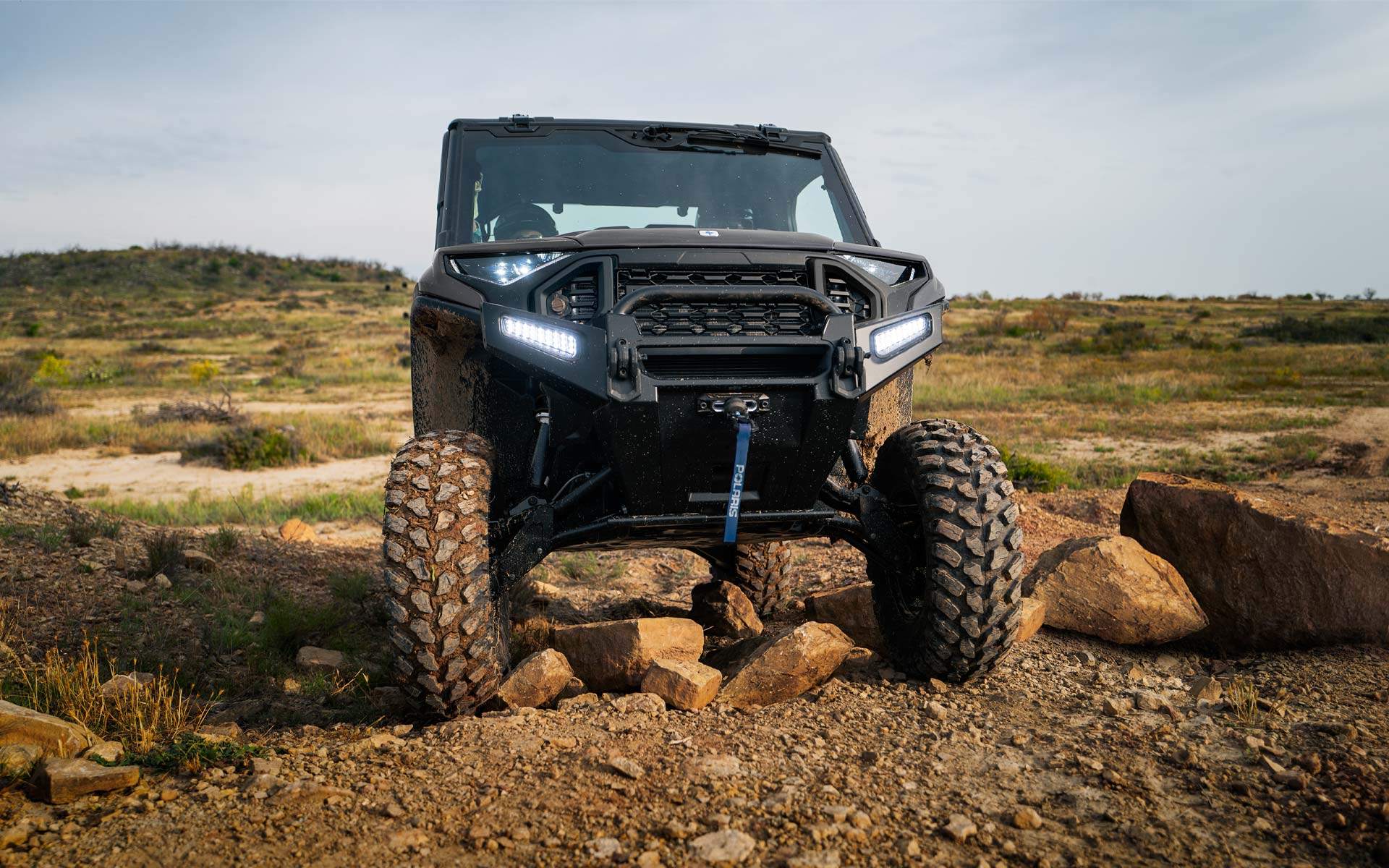 - Factory-installed cab system with powered doors, roof, tip-out glass windshield, glass rear panel, rearview mirror, windshield wiper/washer, and sound insulation materials, Factory-installed heat, AC, defrost, recirculation with 5 different airflow settings, Speed limiting controlled in RIDE COMMAND, 140-amp charging system, Polaris PULSE electrical system (3-position hood and 3-position roof), USB charger, trickle charger, 12-volt accessory outlet, battery trickle-charging port, Pro Series LB Winch with synthetic rope, Auto Stop, wireless remote and Rapid Rope Recovery, Large steel bumper, full-coverage skid plate, bumper D-rings, and top bar.